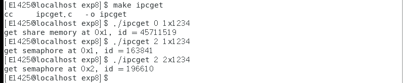 程序 ipcget 用于在指定的键值上获取 ipc 内核对象的 id 号。使用格式为 ./ipcget ,比如 ./ipcget 0 0x8888 表示获取键值 0x8888 上的共享内存 id 号。