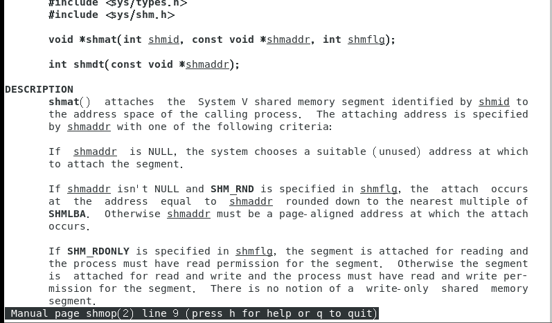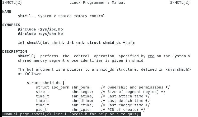 //shmctl.c #include <unistd.h> #include <sys/ipc.h> #include <sys/shm.h> #include <stdio.h> #include <time.h>#include <stdlib.h>#include <string.h>#define ASSERT(res) if((res)<0){perror(__FUNCTION__);exit(-1);} // 打印 ipc_perm void printPerm(struct ipc_perm *perm) { printf("euid of owner = %d\n", perm->uid); printf("egid of owner = %d\n", perm->gid); printf("euid of creator = %d\n", perm->cuid); printf("egid of creator = %d\n", perm->cgid); printf("mode = 0%o\n", perm->mode);}// 打印 ipc 内核对象信息void printShmid(struct shmid_ds *shmid) { printPerm(&shmid->shm_perm); printf("segment size = %ld\n", shmid->shm_segsz); printf("last attach time = %s", ctime(&shmid->shm_atime)); printf("last detach time = %s", ctime(&shmid->shm_dtime)); printf("last change time = %s", ctime(&shmid->shm_ctime)); printf("pid of creator = %d\n", shmid->shm_cpid); printf("pid of last shmat/shmdt = %d\n", shmid->shm_lpid); printf("No. of current attaches = %ld\n", shmid->shm_nattch);}// 创建 ipc 内核对象void create() { int id = shmget(0x8888, 123, IPC_CREAT | IPC_EXCL | 0664); printf("create %d\n", id); ASSERT(id); }// IPC_STAT 命令使用,用来获取 ipc 内核对象信息 void show() { int id = shmget(0x8888, 0, 0); ASSERT(id); struct shmid_ds shmid; ASSERT(shmctl(id, IPC_STAT, &shmid)); printShmid(&shmid);}// IPC_SET 命令使用,用来设置 ipc 内核对象信息 void set() { int id = shmget(0x8888, 123, IPC_CREAT | 0664); ASSERT(id); struct shmid_ds shmid; ASSERT(shmctl(id, IPC_STAT, &shmid)); shmid.shm_perm.mode = 0600; ASSERT(shmctl(id, IPC_SET, &shmid)); printf("set %d\n", id); }// IPC_RMID 命令使用,用来删除 ipc 内核对象 void rm() { int id = shmget(0x8888, 123, IPC_CREAT | 0664); ASSERT(id); ASSERT(shmctl(id, IPC_RMID, NULL)); printf("remove %d\n", id); }// 挂接和卸载 void at_dt() { int id = shmget(0x8888, 123, IPC_CREAT | 0664); ASSERT(id); char *buf = shmat(id, NULL, 0); if (buf == (char*)-1) ASSERT(-1); printf("shmat %p\n", buf); sleep(5); // 等待 5 秒后,执行 shmdt ASSERT(shmdt(buf)); printf("shmdt %p\n", buf); }int main(int argc, char *argv[]) { if (argc < 2) { printf("usage: %s <option -c -v -s -d -a>\n", argv[0]); return -1; } printf("I'm %d\n", getpid()); if (!strcmp(argv[1], "-c")) { create(); } else if (!strcmp(argv[1], "-v")) { show(); } else if (!strcmp(argv[1], "-s")) { set(); } else if (!strcmp(argv[1], "-d")) { rm(); } else if (!strcmp(argv[1], "-a")) { at_dt(); } return 0;}