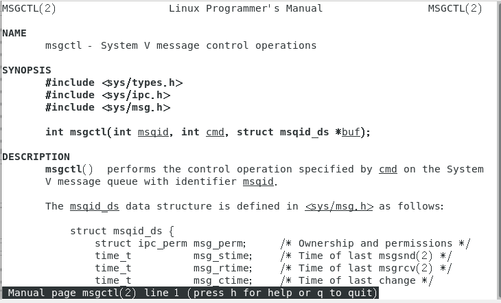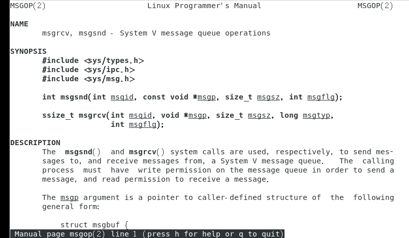 #include <unistd.h> #include <sys/ipc.h>#include <sys/msg.h> #include <stdio.h>#include <stdlib.h>#define ASSERT(prompt,res) if((res)<0){perror(#prompt);exit(-1);} typedef struct { char name[20]; int age; }Person;typedef struct { long type; Person person;}Msg;int main(int argc, char *argv) { int id = msgget(0x8888, IPC_CREAT | 0664); ASSERT(msgget, id); Msg msg[10] = { {1, {"Luffy",17}}, {1, {"Zoro",19}}, {2, {"Nami",18}}, {2, {"Usopo",17}}, {1, {"Sanji",19}}, {3, {"Chopper",15}}, {4, {"Robin",28}}, {4, {"Franky",34}}, {5, {"Brook",88}}, {6, {"Sunny",2}} }; int i; for (i = 0; i < 10; ++i) { int res = msgsnd(id, &msg[i], sizeof(Person), 0); ASSERT(msgsnd, res); } return 0;}// msg_recv.c