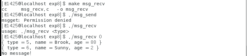 #include <unistd.h>#include <sys/types.h>#include <sys/ipc.h>#include <sys/msg.h>#include <stdio.h>#include <stdlib.h>#include <errno.h>#define ASSERT(prompt,res) if((res)<0){perror(#prompt);exit(-1);}typedef struct {char name[20];int age;}Person;typedef struct {long type;Person person;}Msg;void printMsg(Msg *msg) {printf("{ type = %ld, name = %s, age = %d }\n",msg->type, msg->person.name, msg->person.age);}int main(int argc, char *argv[]) {if (argc < 2) {printf("usage: %s <type>\n", argv[0]); return -1; }long type = atol(argv[1]);int id = msgget(0x8888, 0); ASSERT(msgget, id); Msg msg; int res; while(1) { res = msgrcv(id, &msg, sizeof(Person), type, IPC_NOWAIT); if (res < 0) { if (errno == ENOMSG) { printf("No message!\n"); break; } else { ASSERT(msgrcv, res); } } printMsg(&msg); } return 0;}