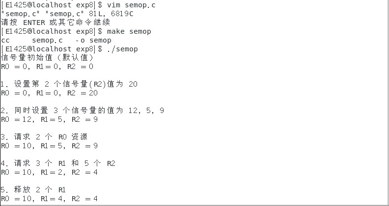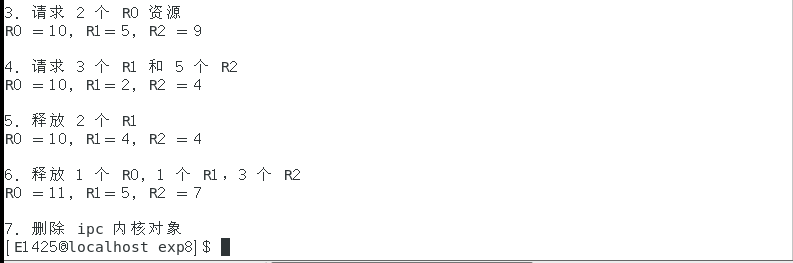 #include <unistd.h> #include <sys/ipc.h> #include <sys/sem.h>#include <stdio.h>#include <stdlib.h> #define R0 0#define R1 1 #define R2 2 void printSem(int id) { unsigned short vals[3] = { 0 }; semctl(id, 3, GETALL, vals); printf("R0 = %d, R1= %d, R2 = %d\n\n", vals[0], vals[1], vals[2]); }int main() { int id = semget(0x8888, 3, IPC_CREAT | IPC_EXCL | 0664); // 打印信号量值 puts("信号量初始值(默认值)"); printSem(id); // 1. 设置第 2 个信号量值 puts("1. 设置第 2 个信号量(R2)值为 20"); semctl(id, 2, SETVAL, 20); printSem(id); // 2. 同时设置 3 个信号量的值 puts("2. 同时设置 3 个信号量的值为 12, 5, 9"); unsigned short vals[3] = {12, 5, 9}; semctl(id, 0, SETALL, vals); printSem(id); // 3. 请求 2 个 R0 资源 puts("3. 请求 2 个 R0 资源"); struct sembuf op1 = {0, -2, 0}; semop(id, &op1, 1); printSem(id); // 4. 请求 3 个 R1 和 5 个 R2 puts("4. 请求 3 个 R1 和 5 个 R2"); struct sembuf ops1[2] = { {1, -3, 0}, {2, -5, 0} }; semop(id, ops1, 2); printSem(id); // 5. 释放 2 个 R1 puts("5. 释放 2 个 R1"); struct sembuf op2 = {1, 2, 0}; semop(id, &op2, 1); printSem(id); // 6. 释放 1 个 R0, 1 个 R1,3 个 R2 puts("6. 释放 1 个 R0, 1 个 R1,3 个 R2"); struct sembuf ops2[3] = { {0, 1, 0}, {1, 1, 0}, {2, 3, 0} }; semop(id, ops2, 3); printSem(id); // 7. 删除 ipc 内核对象 puts("7. 删除 ipc 内核对象"); semctl(id, 0, IPC_RMID); return 0; }