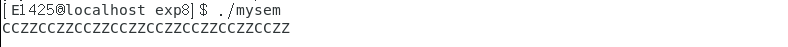 #include<stdlib.h>#include<sys/ipc.h>#include<sys/sem.h> static int semid; static void sem_set(){ if(semctl(semid,0,SETVAL,1)==-1) { perror("semctl"); exit(1); } }static void sem_p(){ struct sembuf op = {0,-1,0}; if(semop(semid,&op,1) == -1){ perror("semop"); exit(1); } }static void sem_v(){ struct sembuf op = {0,1,0}; if(semop(semid,&op,1) == -1){ perror("semop"); exit(1); }}static void sem_del(){ if(semctl(semid,0,IPC_RMID) == -1){ perror("semctl"); exit(1); }}int main(){ int i; pid_t pid; char ch = 'C'; semid = semget((key_t)1000,1,0664|IPC_CREAT); if(semid == -1){ perror("semget"); exit(1); } sem_set(); pid = fork(); if(pid == -1){ sem_del(); exit(1); } else if (pid == 0) ch = 'Z'; else ch = 'C'; srand((unsigned int)getpid()); for(i=0;i<8;i++) { sem_p();// printf("%c",ch); fflush(stdout); sleep(rand()%4); printf("%c",ch); fflush(stdout); sleep(1); sem_v();// } if(pid > 0) { wait(NULL); sem_del(); } printf("\n"); return 0;}