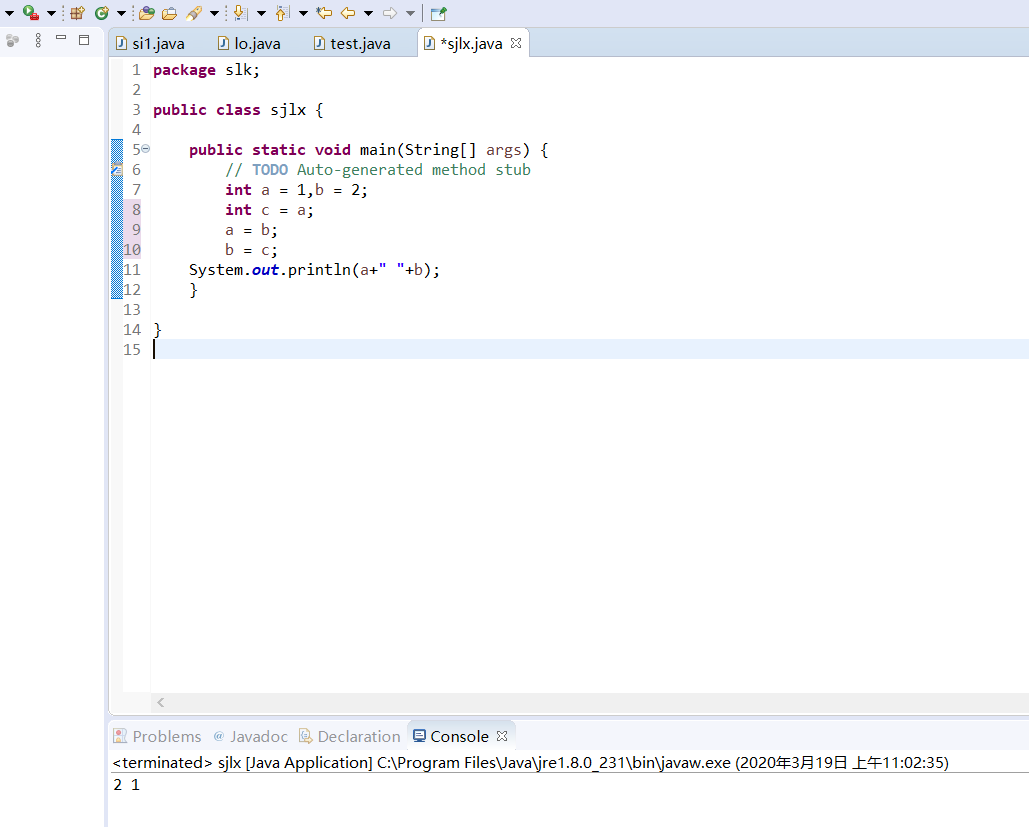 package slk; public class sjlx { public static void main(String[] args) { // TODO Auto-generated method stub int a = 1,b = 2; int c = a; a = b; b = c; System.out.println(a+" "+b); } }
