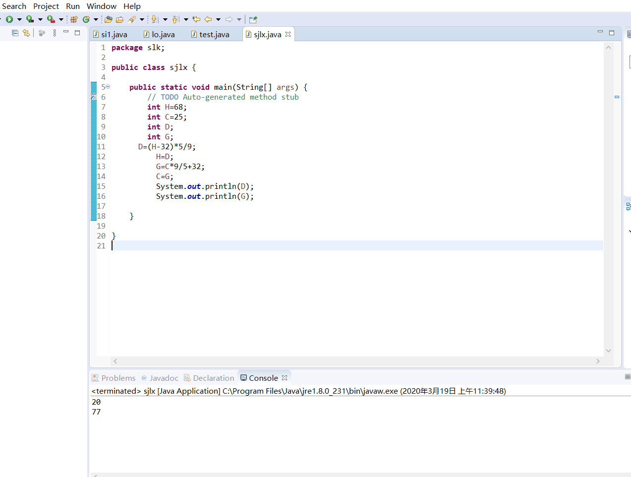 package slk; public class sjlx { public static void main(String[] args) { // TODO Auto-generated method stub int H=68; int C=25; int D; int G; D=(H-32)*5/9; H=D; G=C*9/5+32; C=G; System.out.println(D); System.out.println(G); } }