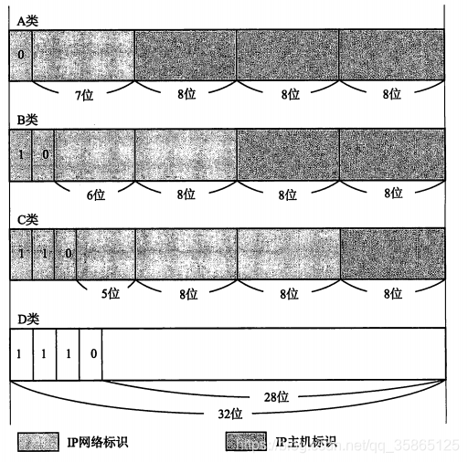 D类IP地址:前4个bit为1110,从第1位到第32位是它的网络标识,没有主机地址,常被用于多播。