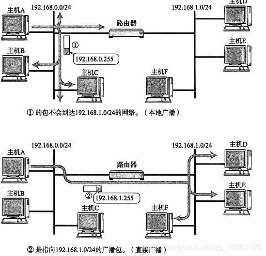 举例子:有一个网络地址192.168.0.0/24(表示前24bit为网络地址),该自网络的广播地址为192.168.1.255,如果该子网络内的一台计算机向192.168.1.255发出一个数据,那么这份数据能被这个自网络内的全部计算机接受到,,这就是本地广播;如果这个计算机向192.168.0.255/24(另一个子网络的广播地址),则该只有该子网络内的全部计算机能够收到这份数据,,这就是直接广播。