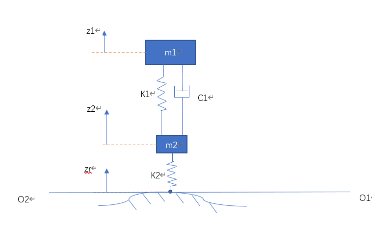 建模: 弹簧阻尼系统,取系统处于静平衡的位置为原点,以消除重力的参与。O1-O2为水平基准,即m1的垂向位移为z1, m2的为z2,外部的激励输入为zr,当处于