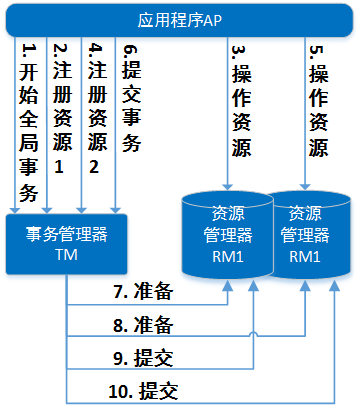 一个全局事务管理器(TM,Transaction Manager):负责管理全局事务状态与参与的资源,协同资源一起提交或回滚;