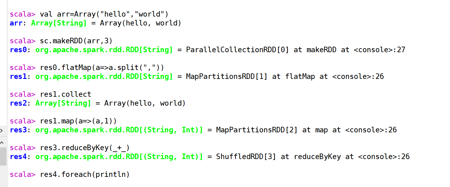 wordcount的demo 在命令行中,这里的结果要在网页的结果中看到,如果要在命令行中看到结果需要xxx.collect 将结果收集到本地