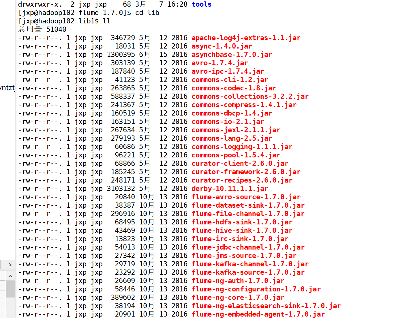 方法是将flume/lib/ 目录下该文件删除,或者将hadoop中该文件拷贝过来替换掉,我选择删除该文件