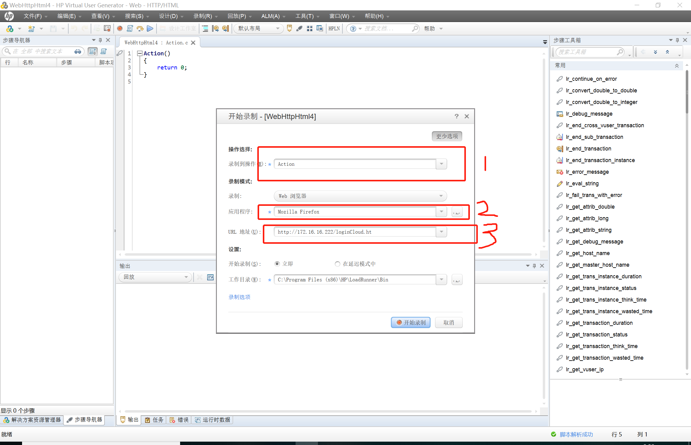 1是录制的内容添加到脚本的那个步骤里面 2是录制的时候使用的浏览器 3是开始录制时浏览器进入的网址