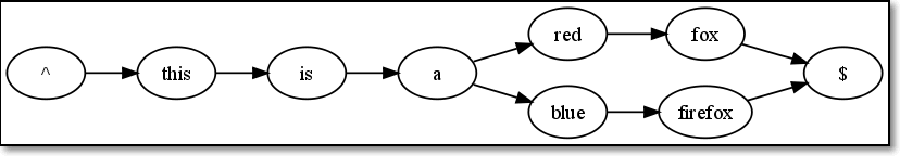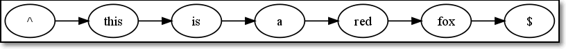 第一行文本为this is a red fox。那么,从^this is a red fox$应该是$re的一个(真)子集。它的路径为:“^”->this->is->a->red->fox->”$”。全部节点之间,是串联关系,从左到右依次排列即可。