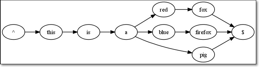 同理,第二行文本也应该是$re的子集。不过,由于已经存在了由^->this->is->a的路径,到a时出现支路,a->blue->firefox->$;
