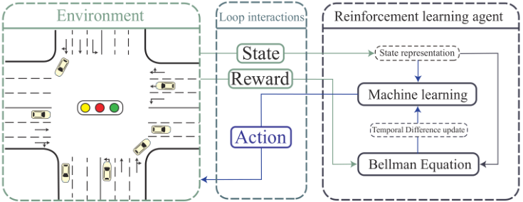 该问题中,Environment 可以是一个 Python 定义的类,输入 action 并输出 state 和 reward。其中,action 表示动作选择;state 表示各个车道的信息,比如该车道的车辆密度等,是一个向量;reward 有多种设计方法,一种可行的设计是其值等于负的各个车道上车辆数的总和。在右侧的强化学习智能体框架内,state 表征(State representation)为表征状态,技术上体现为通过一个编码器,表征状态与 reward 一起输入贝尔曼方程(Bellman equation),通过时序差分法(Temporal difference update) 得到更新目标去训练机器学习模型。贝尔曼方程是动态规划中的一个重要工具,也是 Q 学习的内容,在后面会介绍,也可以用策略梯度方法。