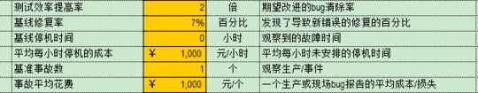 比如ABC公司发现他们的手工测试场景被自动化后,发现的bug数量相比于以前是2倍,则测试效率提高率为2。 在所有需要被修复的10个bug中又有1个需要被重新修复时,基线的修复率为10%,行业的数据一般是7%。 由于遗漏的缺陷而导致线上系统出现计划外故障的时间为基线年度停机时间,比如90小时。 在系统崩溃的时候会造成的商业损失的每小时成本可记为平均每小时停机成本。 还有年度里的遗漏bug数和为了修复这些bug而花费的平均成本。