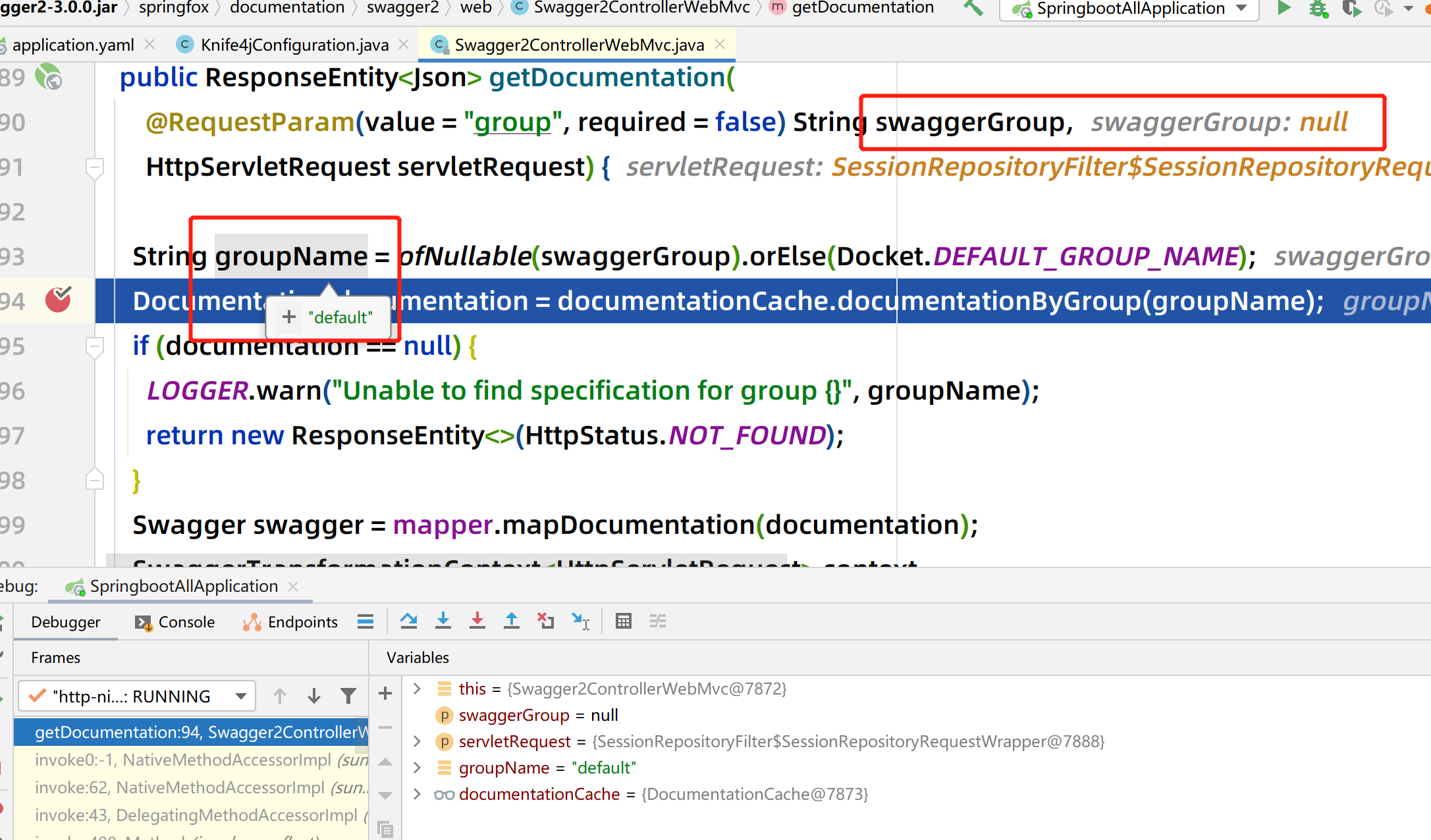 由于document导致的错误,继续debug看是什么原因导致的document没拿到。进入documentationByGroup方法;