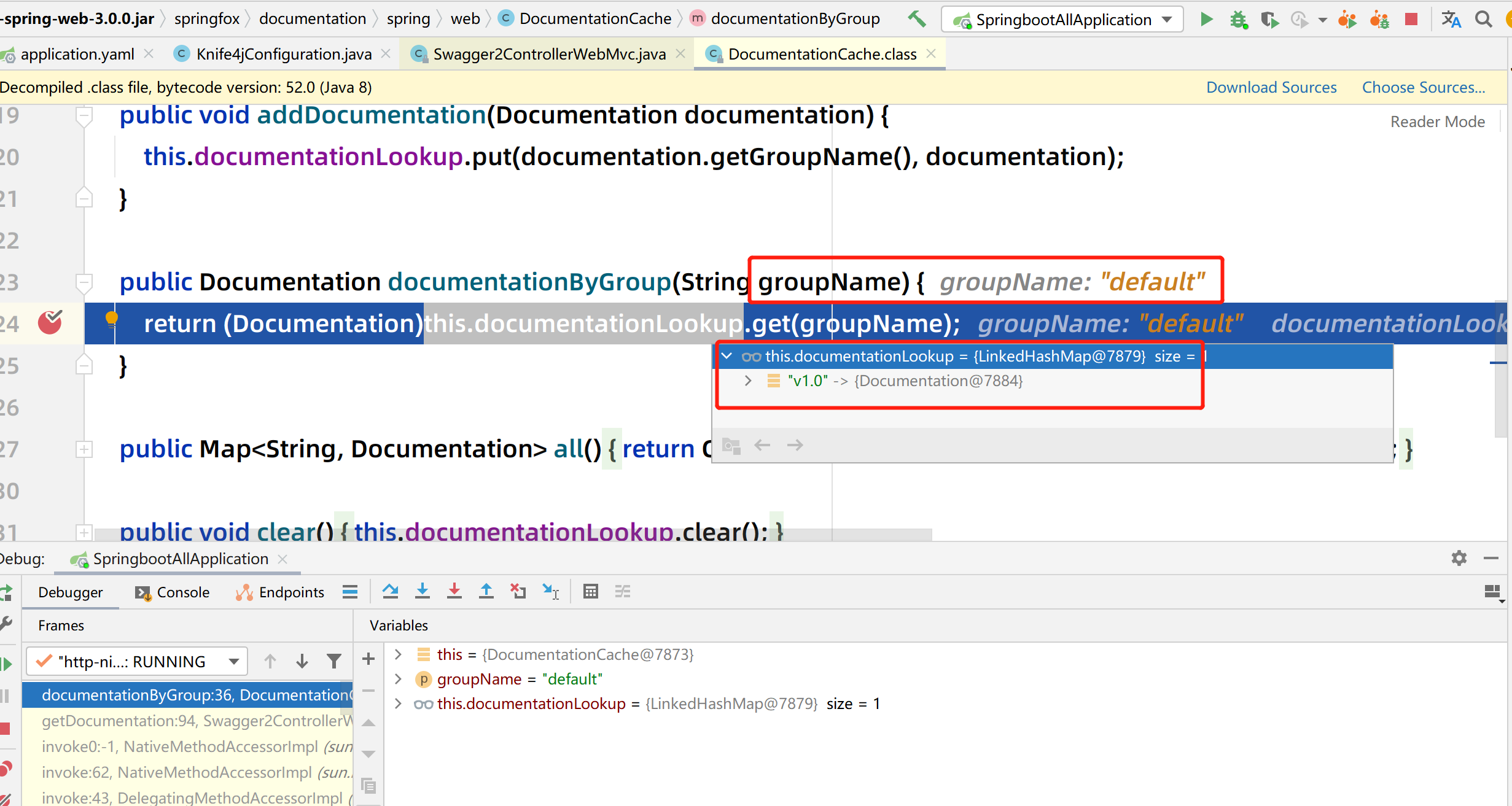 从groupName是default,documentationLookup是一个LinkedHashMap,其中只有v1.0一条数据。