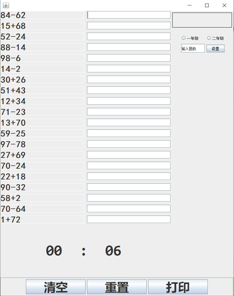 系统开始,随机产生10道加法或者减法,计算完成后,统计做了多少道题,正确率