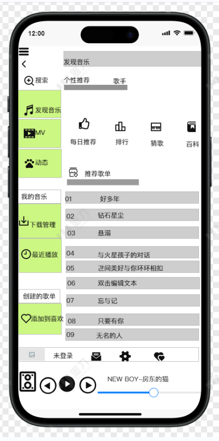 (3)主界面——发现音乐界面,左边为目录栏,通过点击目录栏可以快捷的切换到其他界面。