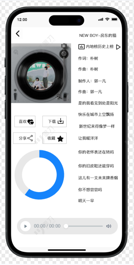 (4)歌单界面——有当前播放歌曲和歌手的基本信息,以及暂停功能,滚动歌条和进度条,歌词,用户对播放音乐可添加喜欢,可收藏,可分享等。