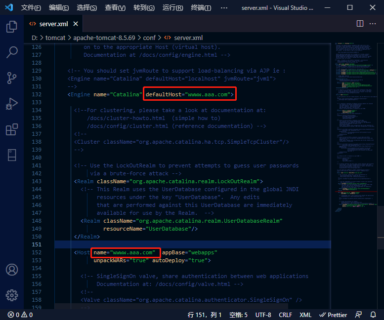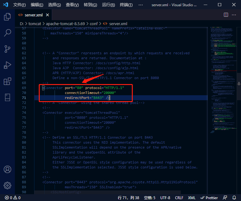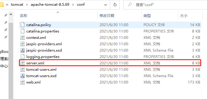使用vscode(非必要)打开tomcat文件夹下的conf内的server.xml