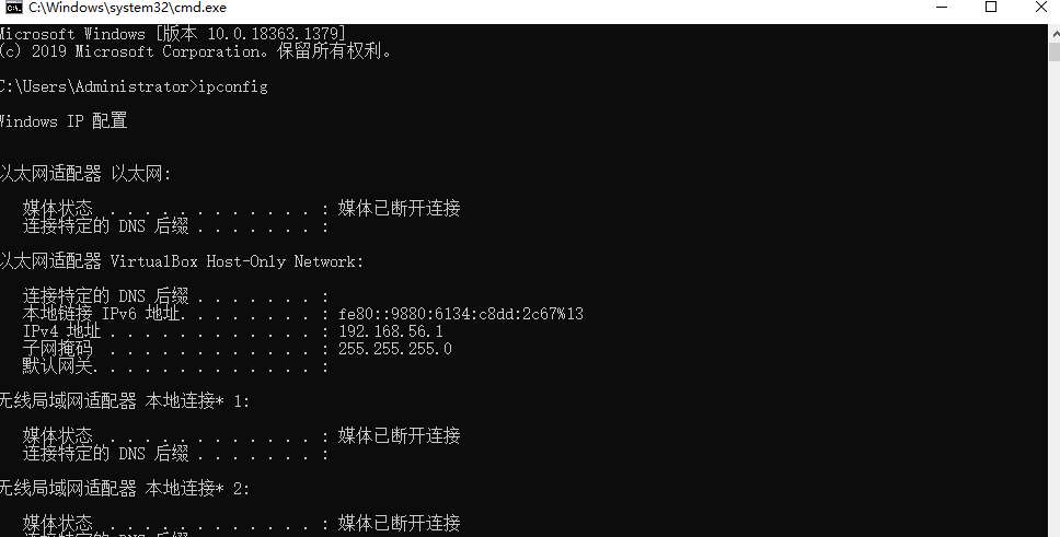 1打开cmd 输入 ipconfig 查看 virtualBox 的IP为多少