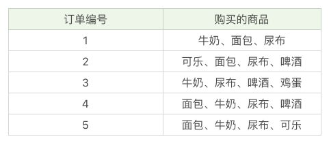 在这个例子中,我们能看到“牛奶”出现了 4 次,那么这 5 笔订单中“牛奶”的支持度就是 4/5=0.8。