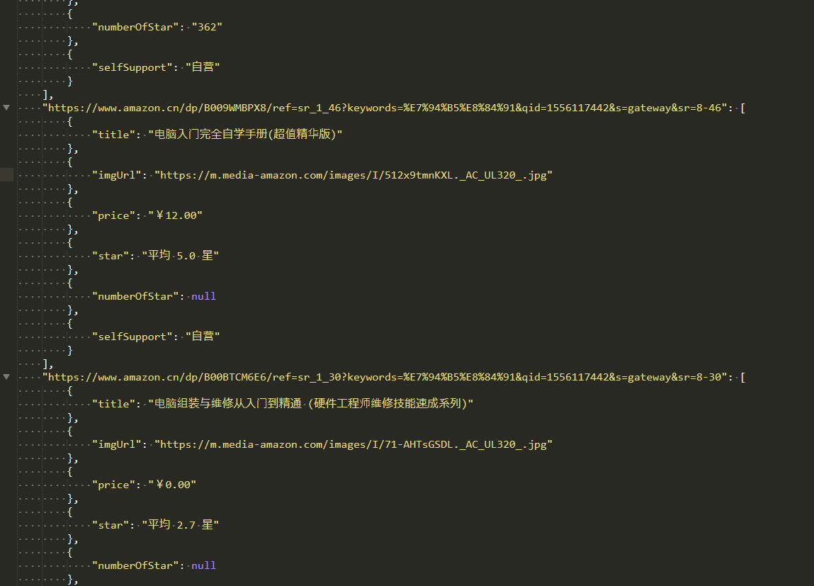 import requests import re import json from bs4 import BeautifulSoup from urllib.parse import urljoin headers = { 'User-Agent':'Mozilla/5.0 (Windows NT 6.1; WOW64) AppleWebKit/537.36 (KHTML, like Gecko) Chrome/55.0.2883.87 Safari/537.36' } #用于伪造请求头 original_url = 'https://www.amazon.cn' def get_onePage(key,page): url = "https://www.amazon.cn/s?k="+key+'&page='+str(page) #k后面的为搜索的关键字 r = requests.session() #利用requests.session()去请求页面可以记住cookies res = r.get(url=url,headers=headers) res.encoding = res.apparent_encoding #设置编码为requests从内容中分析出的编码方式而不是网站给出的编码 soup = BeautifulSoup(res.text,"lxml") result = soup.find_all(name='div',attrs={'data-index':True,'class':re.compile("sg-col-4-of-16 sg-col")}) onePage = {} temp = {} for i in result: ''' 这里是获取详情,跟网页的结构有关,其实不必太在意这部分 ''' title = i.find(name="span",attrs={'class':'a-size-base-plus a-color-base a-text-normal'}) title = title.string if title else '' #标题 imgUrl = i.find(name="img", attrs={'class': 's-image'}) imgUrl = imgUrl.attrs['src'] if imgUrl else '' #商品图片链接 price = i.find(name="span", attrs={'class': 'a-offscreen'}) price = price.string if price else '' #商品价格 star = i.find(name="span", attrs={'class': 'a-icon-alt'}) star = star.string if star else '' #星星 numberOfStar = i.find(name="span", attrs={'class': 'a-size-base'}) numberOfStar = numberOfStar.string if numberOfStar else '' #(给星星的)评价的人数 selfSupport = i.find(name="span", attrs={'class': 's-self-operated aok-align-bottom aok-inline-block a-text-normal'}) selfSupport = selfSupport.string if selfSupport else '' #是否是自营 detailUrl = i .find(name='a',attrs={'class':'a-link-normal a-text-normal'}) detailUrl = urljoin(original_url,detailUrl.attrs['href'])if detailUrl else '' #商品详情链接 onePage[detailUrl] = [{'title':title},{'imgUrl':imgUrl},{'price':price},{'star':star},{'numberOfStar':numberOfStar},{'selfSupport':selfSupport}] return onePage for i in range(1,11): #没有登录的话亚马逊只给出10页的匹配到关键字的商品 content = get_onePage('电脑', i) with open('amazon.json','a',encoding='utf-8') as f: json.dump(content, f, ensure_ascii=False, sort_keys=True, indent=4) #获取的内容格式写入json文件