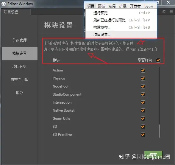 (2)代码:代码体积(引擎+业务逻辑代码) -大头在引擎。解决方案:引擎:非常简单,你只要把不要的模块去掉就可以了,你要知道哪些模块是占体积多的,物理引擎,能不用的模块,就不用。【项目设置】-【模块设置】,只打包必要模块即可。