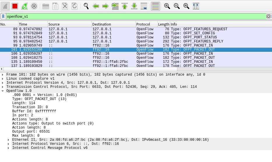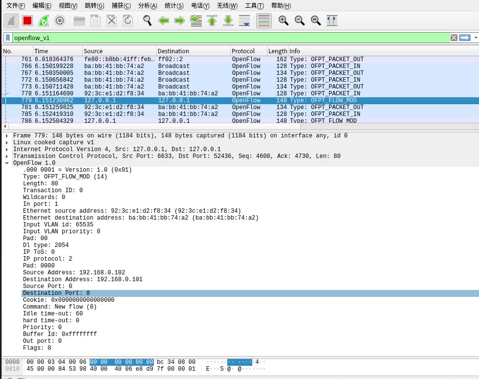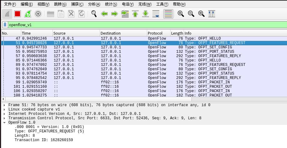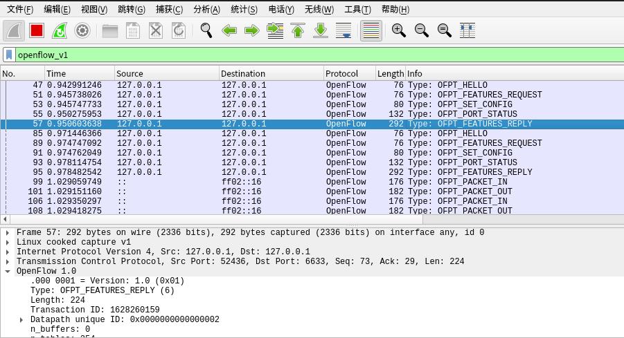 控制器6633端口(OpenFlow 1.0) ---> 交换机52436端口