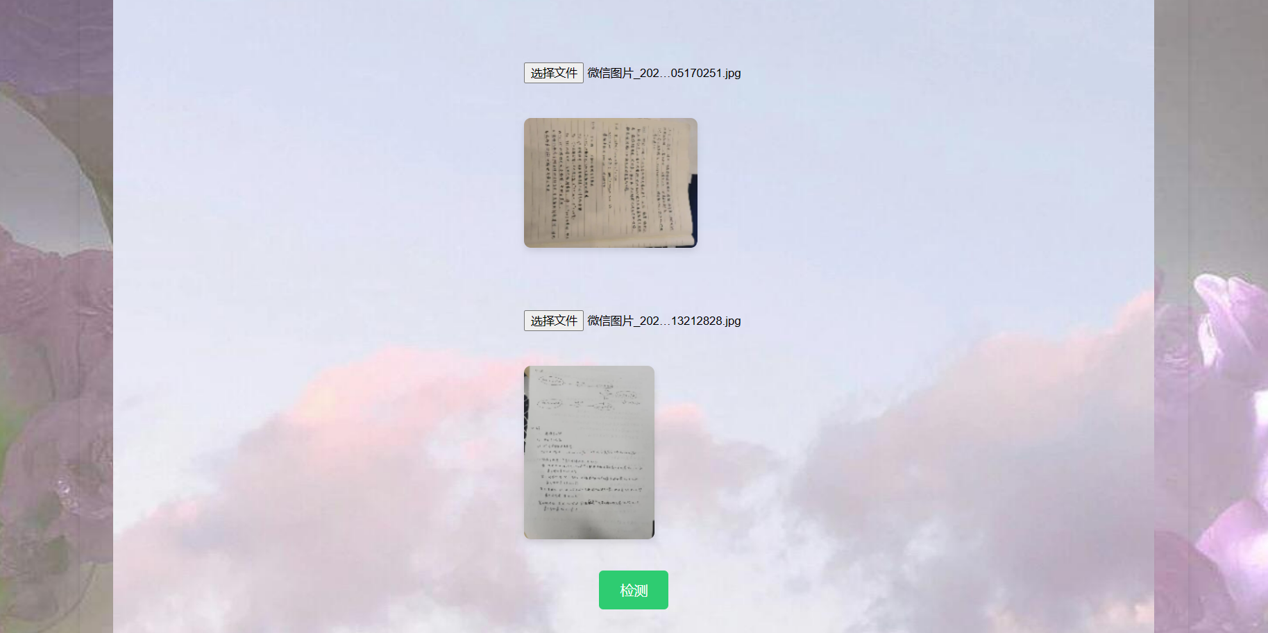 本周的时间里,我们完成了前端与后端的连接,并且经过调试后可以运行。我们对后端的代码进行了优化,将两张图片显示变化的地方用框标出来,使其更加醒目。我们还对网页进行了优化,将上传的图片可以在网页之中显示出来,使其使用起来更加方便快捷。