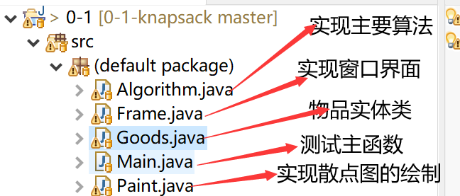 在此次项目开发过程中,主要包含有5个类文件,分别为:Algorithm.java,Frame.java,Main.java,Paint.java,Goods.java,如下图所示: