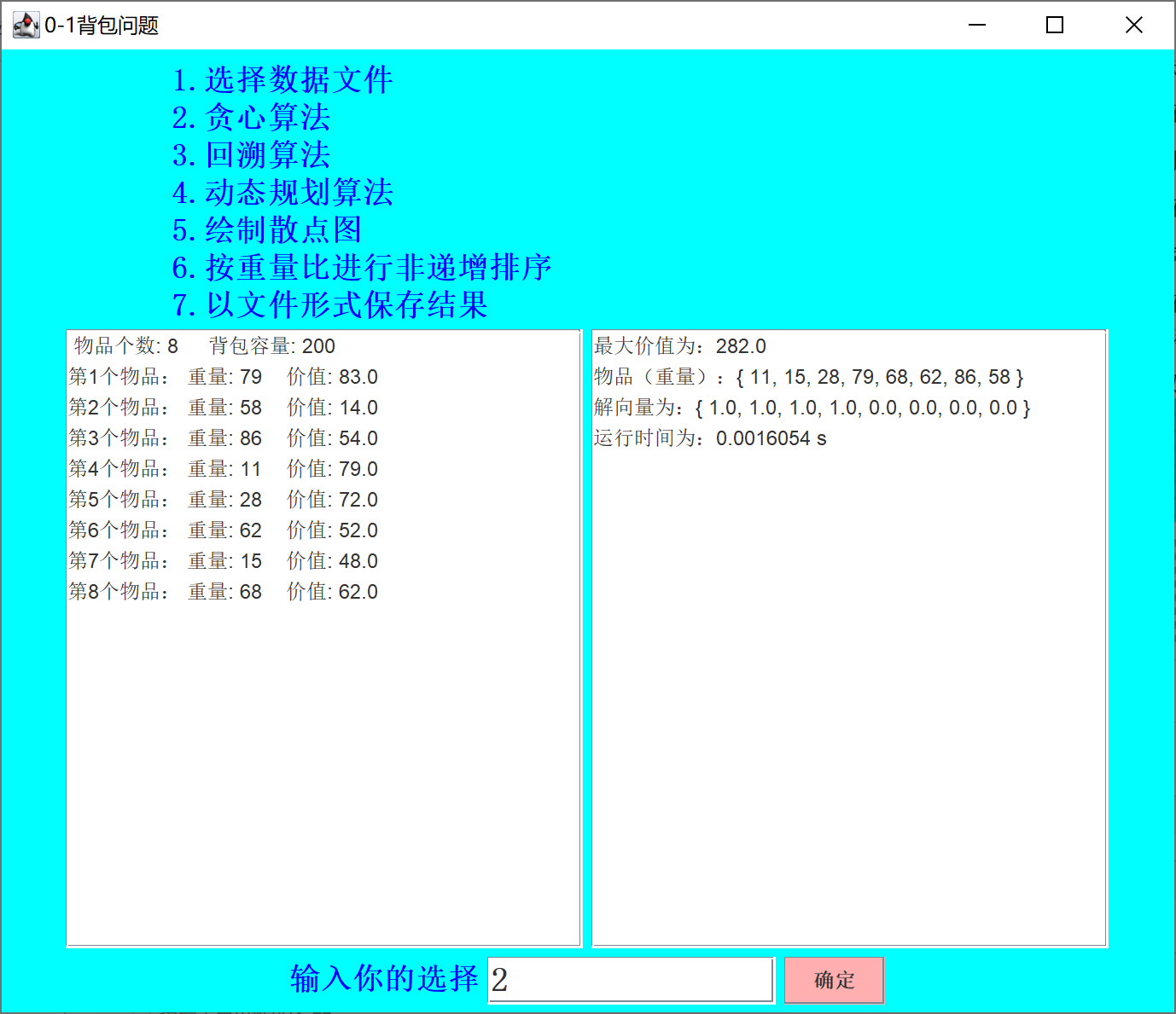 在用户选择所要读取的数据后,在窗口输入框中输入回溯算法求解的功能编号,就可对所读取的{0-1} KP数据利用回溯算法求得其最优解、求解时间和解向量。 - 动态规划算法