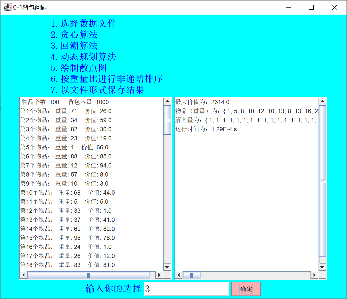 在用户选择所要读取的数据后,在窗口输入框中输入贪心算法求解的功能编号,就可对所读取的{0-1} KP数据利用贪心算法求得其解、求解时间和解向量。(贪心算法在求解过程中,所求得解并非最优解) - 回溯算法