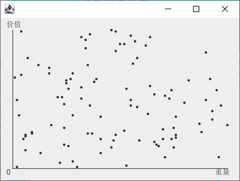 根据提示信息,输入功能编号5,即可根据当前显示的{0-1}KP有效数据绘制以价值重量为横轴、价值为纵轴的数据散点图,通过窗口进行显示,如下图所示(数据文件为beibao4.in):