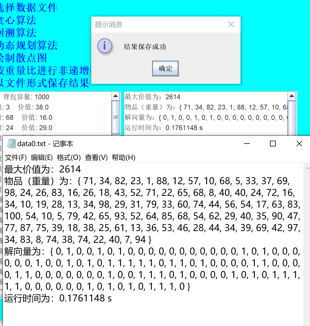 用户在通过自主选择数据及算法求解0-1背包问题后,可自主选择将其结果以txt文件形式进行保存。