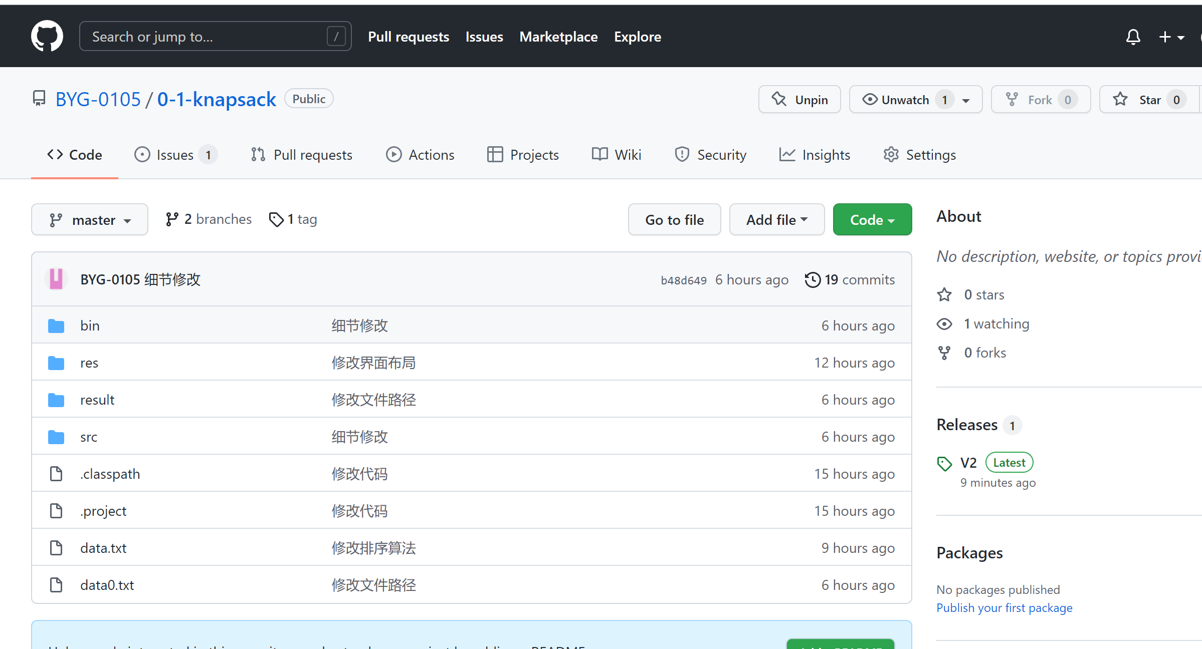 项目开发完成后,已将项目上传至GitHub,仓库名为0-1-knapsack,传送:仓库链接