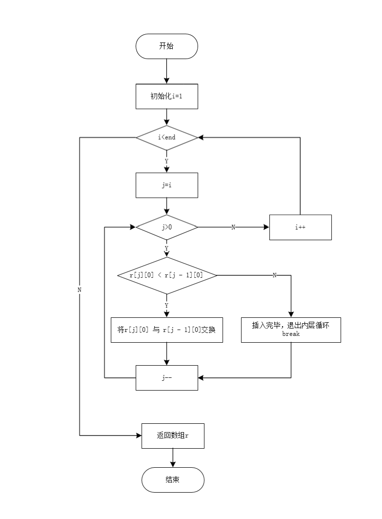 插入排序的基本思想是将一个记录插入到已经排好序的有序表中,在其实现过程使用双层循环,外层循环从第二个开始比较,外层循环对除了第一个元素之外的所有元素,内存循环与前面排好序的数据比较,如果后面的数据小于前面的则交换,如果不小于,说明插入完毕,退出内层循环,接着执行外层循环,直至序列全部有序。其算法流程图如下所示: