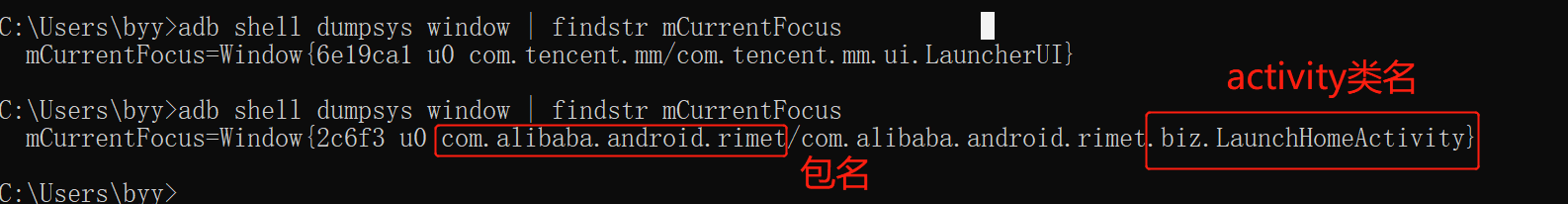 adb shell dumpsys window | findstr mCurrentFocus (推荐)