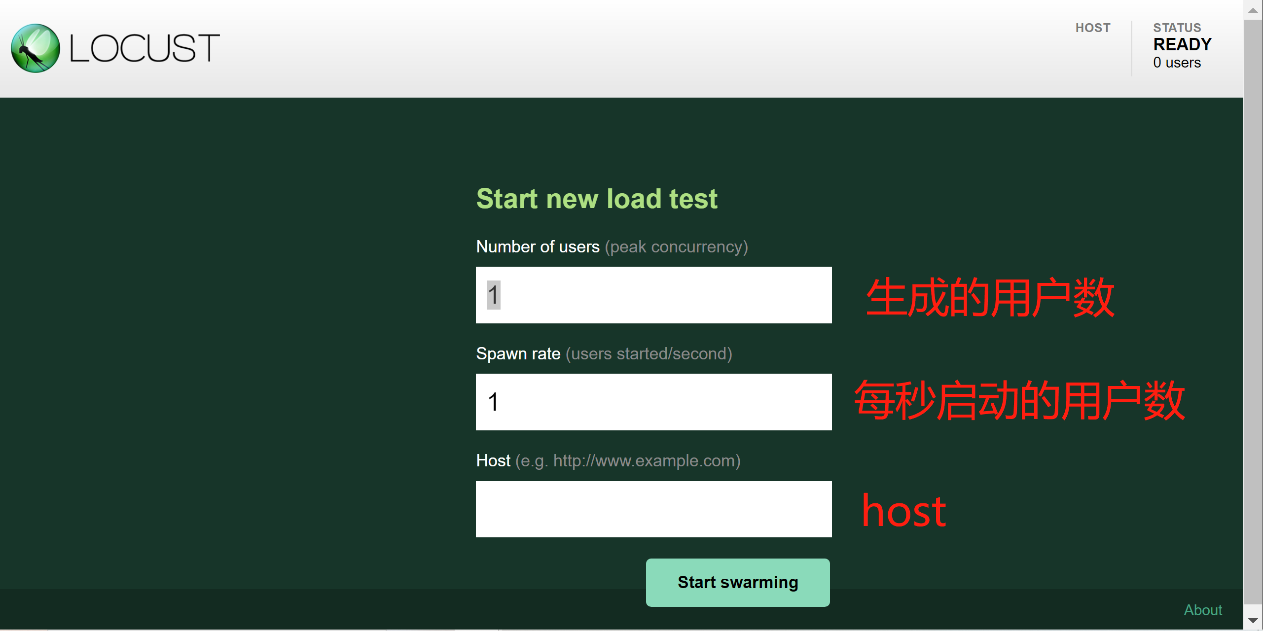 #进入当前模块文件目录,直接输入 locust #非当前文件目录 locust -f xx/xx.py #指定host locust -f xx/xx.py --host=https://www.cnblogs.com #指定locust webui 界面地址, locust -f xx/xx.py --web-host ="127.0.0.1" #不带ui界面运行, locust -f xx/xx.py --headless -u 1000 -r 100 --run-time 5m --headless 没有webui的情况下运行 -u 要生成的用户数 -r 每秒启动的用户数 --run-time 5m 设置测试执行时间 这里是5分钟,时间到了就会停止运行