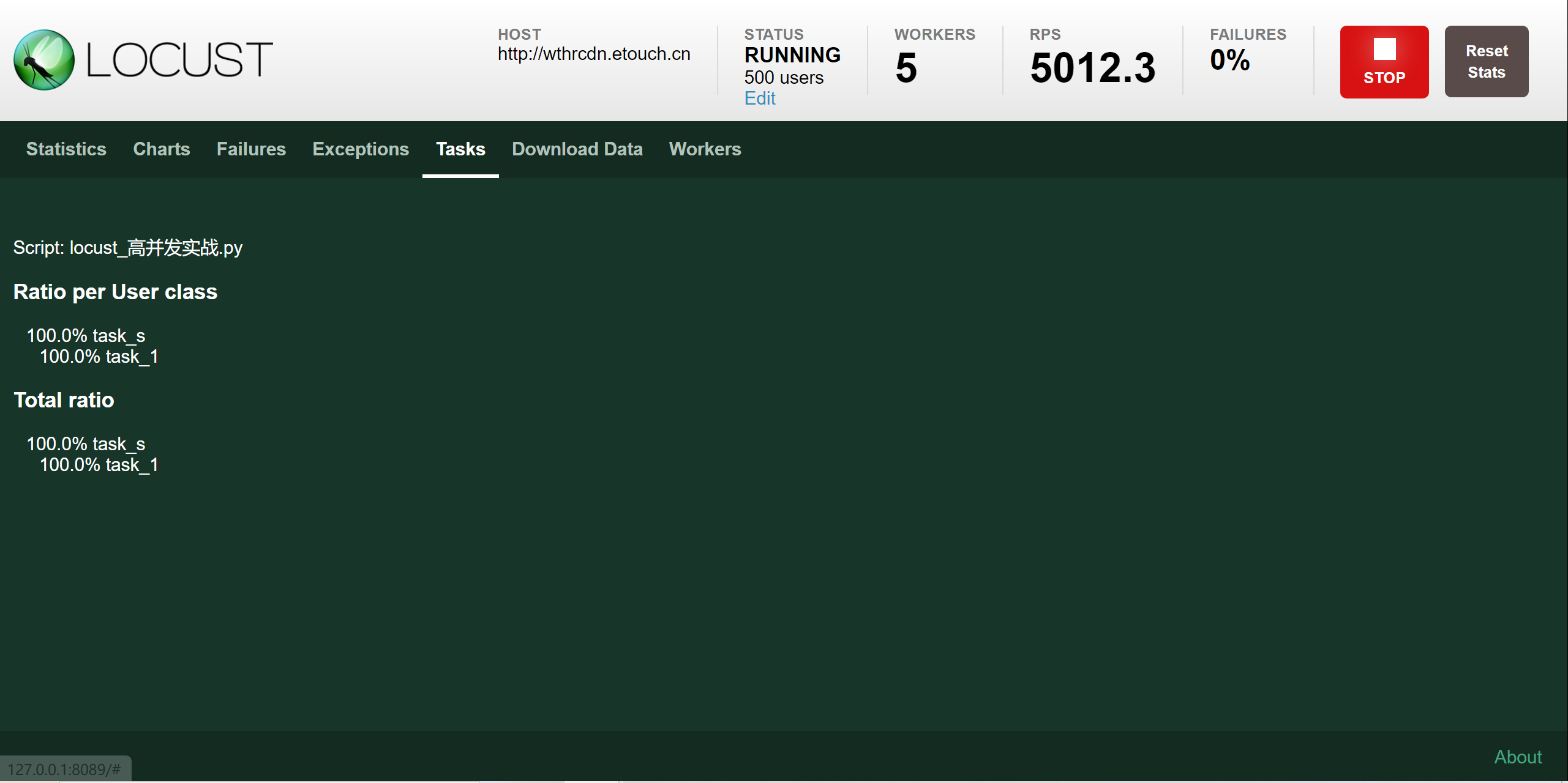 if __name__ == '__main__': os.system('locust -f TaskSet定义用户任务_多个.py --web-host "127.0.0.1"')