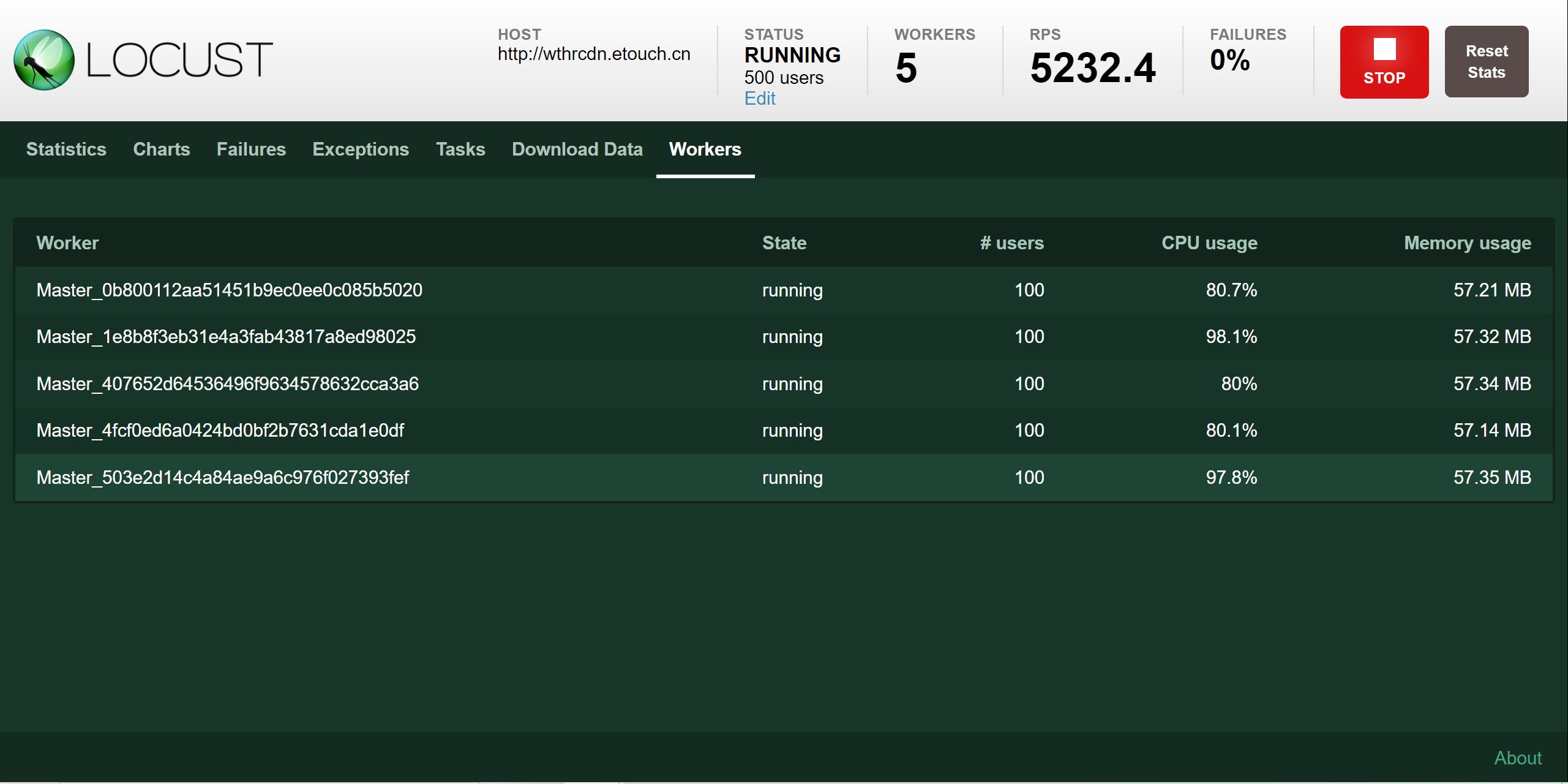 #多进程运行 主模式启动 8089端口用于web界面 ,5557用于从机交互 locust -f xx/xx.py --master 启动一个进行执行 locust -f xx/xx.py --worker --master-host=192.168.0.14 (如果单机器运行,则可以省略后面的参数 --master-host=xxx.xxx.xxx.xxx)