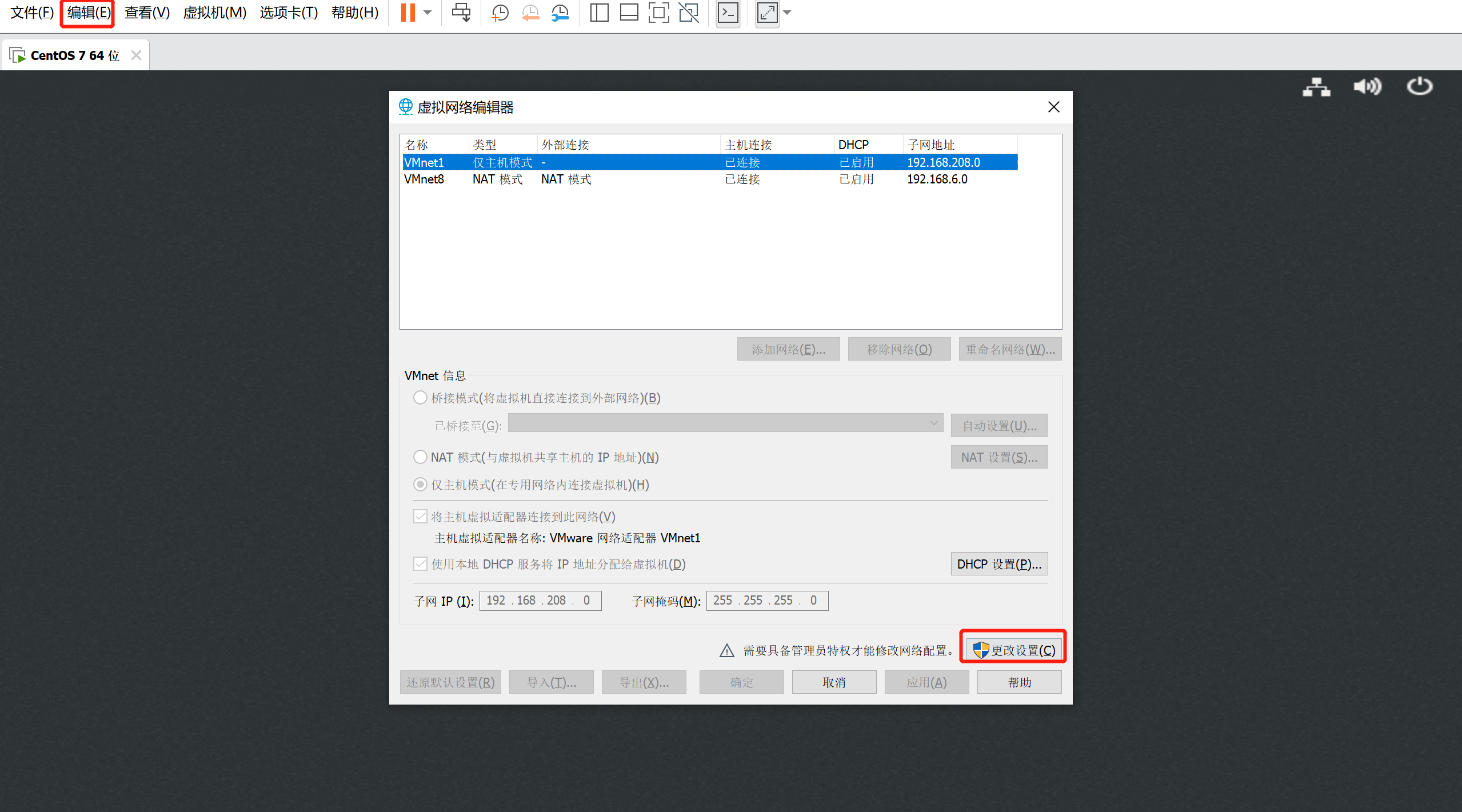 2、设置完毕后我们回到虚拟机:进入编辑=》虚拟网络编辑器=》更改设置