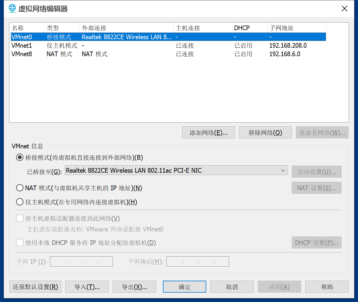 VMnet0 设置为自己的无线网卡 (虚拟机的虚拟网卡都是通过VMnet0和主机网卡进行连接的)