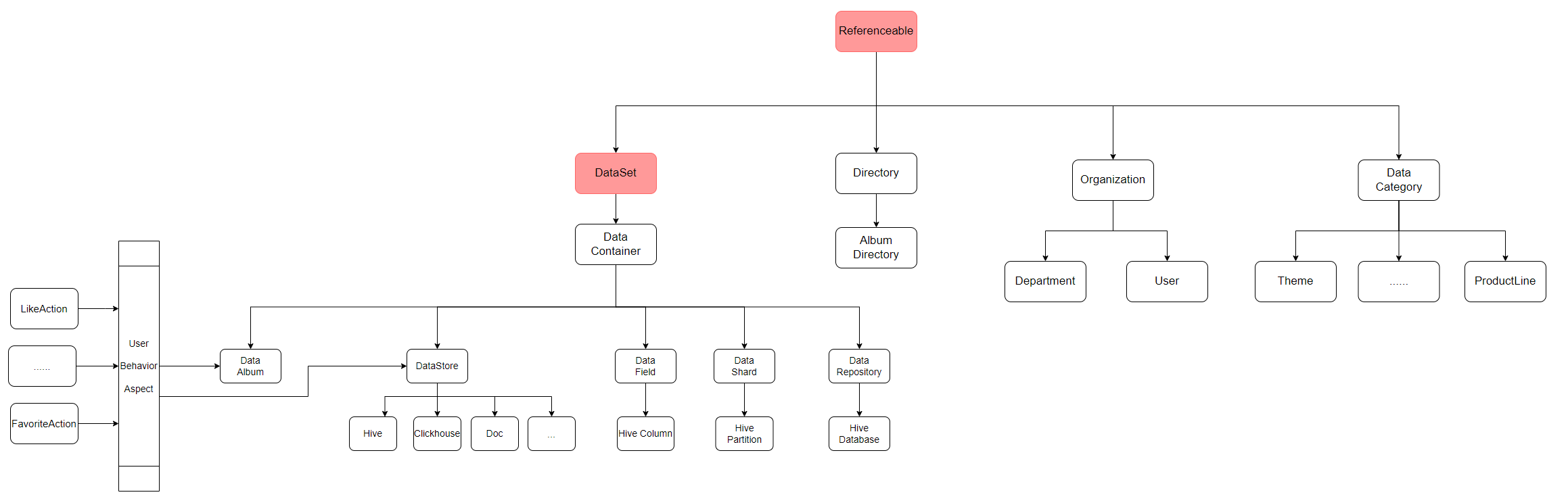 另外一种情况,有些类型的实体可以作用于多种其他的实体,比如一张Hive表和一堆被组织在一起的业务报表,都可以被用户收藏或点赞。我们将收藏、点赞这些行为也抽象为实体,并通过关系与Hive表、业务报表集合等相关联。这种思想,类似编程中的组合或者是切面的概念。