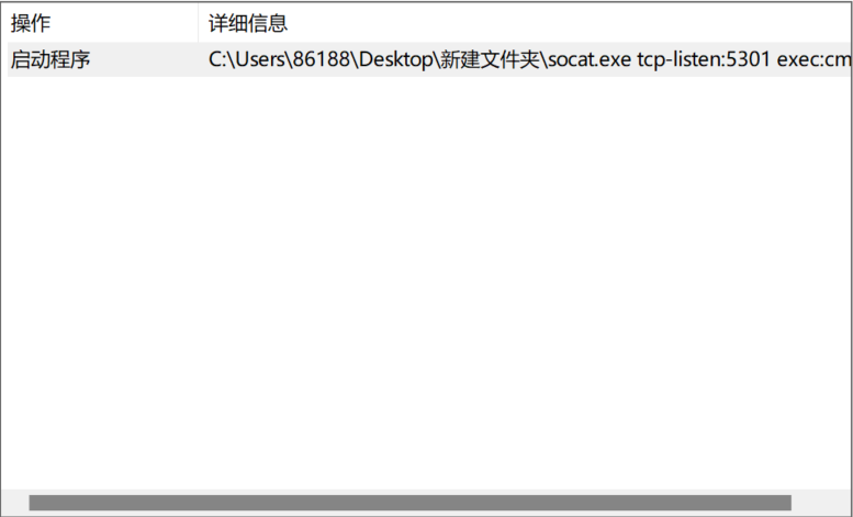 在操作->程序或脚本中选择你的socat.exe文件的路径,在添加参数一栏填写tcp-listen:5301 exec:cmd.exe,pty,stderr,这个命令的作用是把cmd.exe绑定到端口5301,同时把cmd.exe的stderr重定向到stdout上: