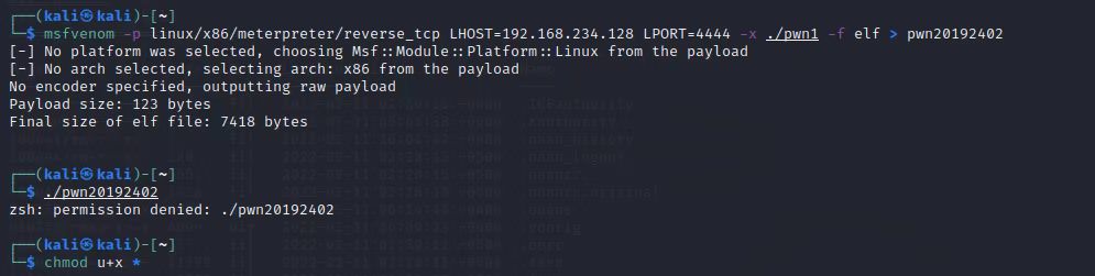 (5)使用MSF生成shellcode,注入到实践1中的pwn1中,获取反弹连接Shell(1分)加分内容一并写入本实验报告。