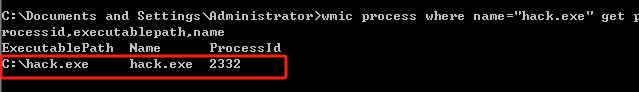 wmic process where name="hack.exe" get processid,executablepath,name