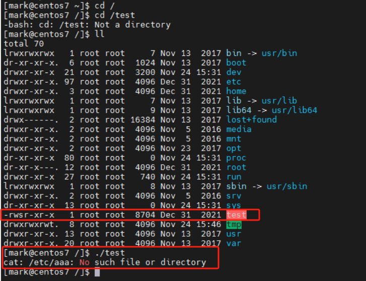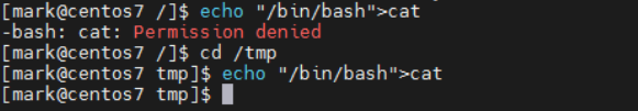 发现test会调用cat命令,此时test文件具有suid权限,如果借助环境变量的执行顺序,再伪造一个cat文件,把cat文件伪造成/bin/bash,那么test调用cat时就会获取一个root权限的shell